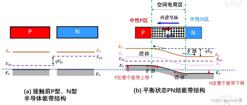 半导体物理——PN结 当P型半导体和N型半导体接触,N区费米能级高于P区费米能级,电子从N区导带流向P区导带,流过来的电子由于能量下降,很快与价带上的空穴复合,同时P区能带上移,N区能带下降,当两者的费米能级达到同一水平时,N区和P区之间形成势垒,势垒区内存在内建电场,N区电子由于能量不足以跨过势垒,停止移动。施加正向电压后,产生的外电场与内建电场方向相反,两者在空间电荷区叠加产生合电场,若外电场小于内建电场,势垒降低,N区导带电子得到外电场的能量,跨过势垒进入P区导带,N区价带的电子也得到能量跨过势垒;