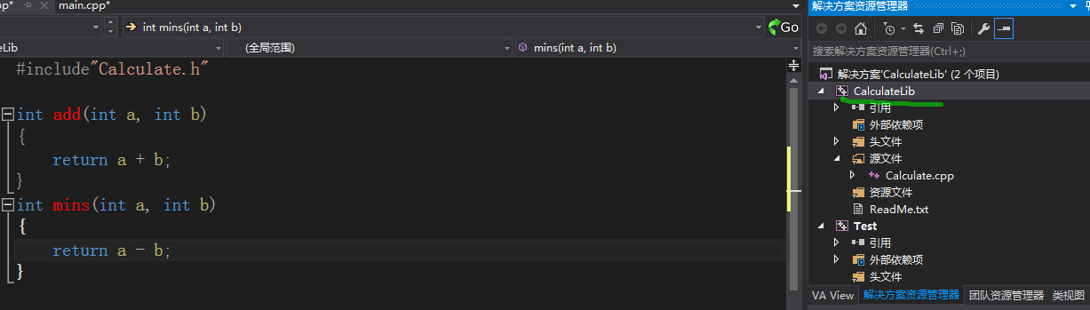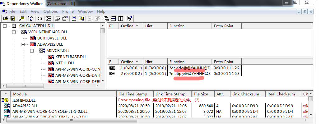 test文件显示调用动态库如下,由于C++的重命名机制导致函数调用不方面;将dll拖入dependency中可以查看dll文件中函数接口(编译后的);若没有函数接口则dll文件生成的有问题;