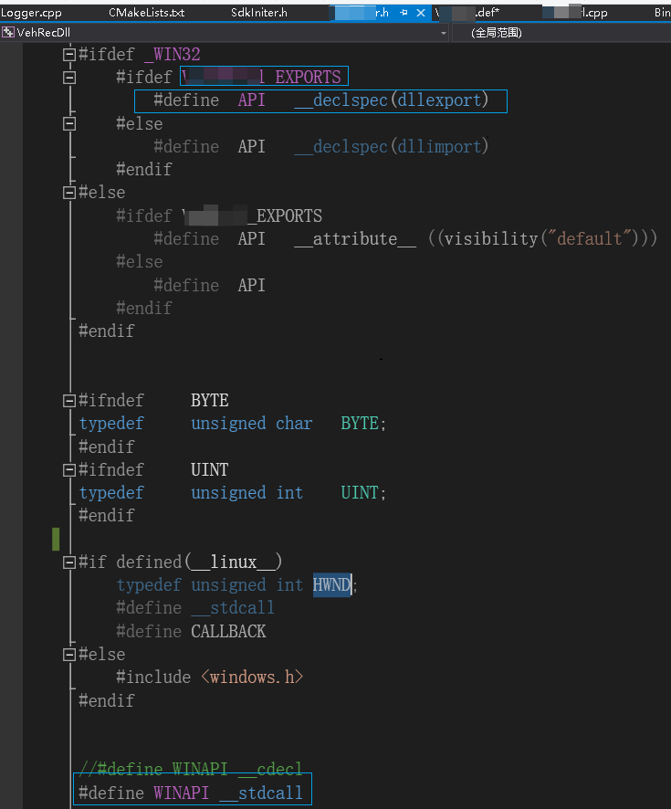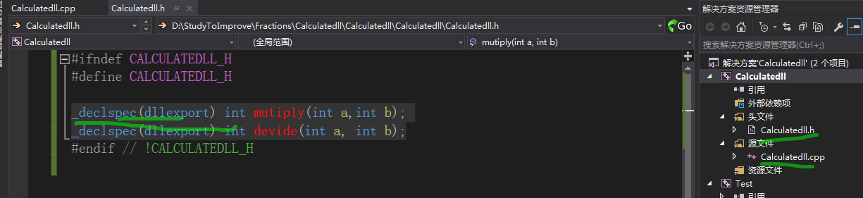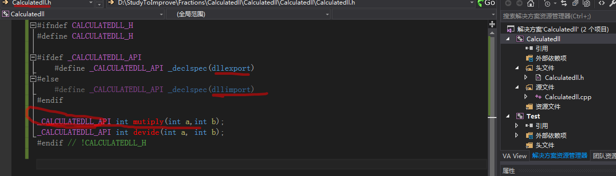 则在dll的头文件中该宏已经定义,走导出声明分支;在Test文件中没定义,走导入声明分支;