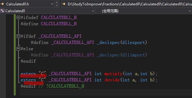 也就是说,使用了def文件,那就不需要extern “C”了,也可以不需要__declspec(dllexport)了(不过,dll的制造者除了提供dll之外,还要提供头文件,需要在头文件里加上这extern”C”和调用约定,因为使用者需要跟制造者遵守同样的规则,除非使用者和制造者使用的是同样的编译器并对调用约定无特殊要求)。