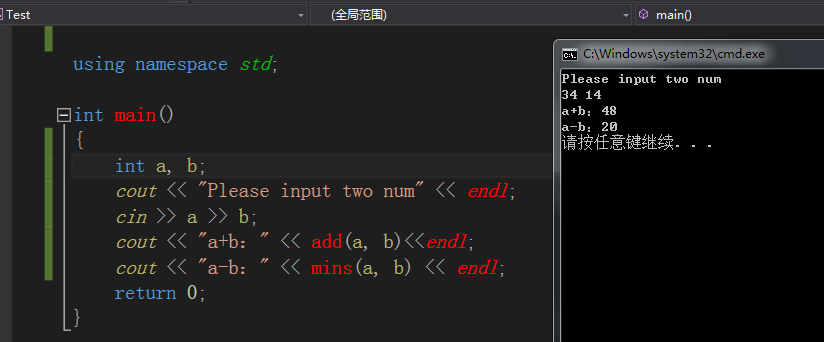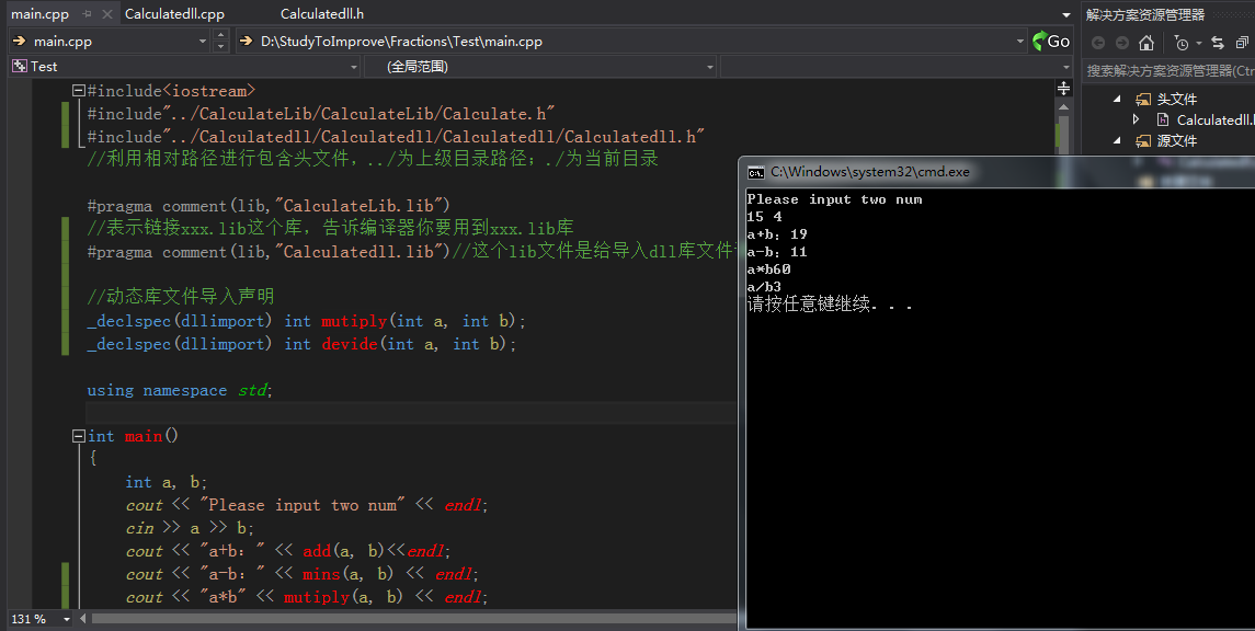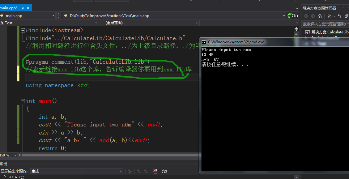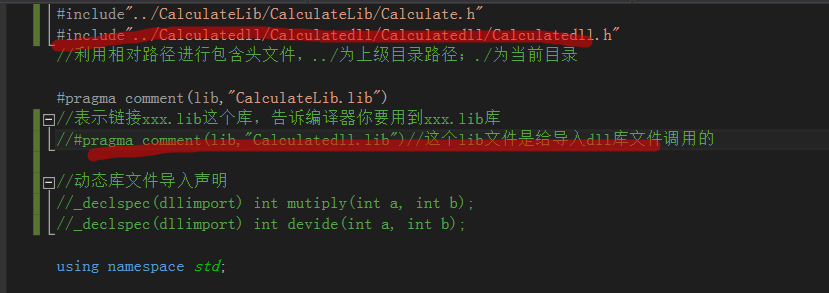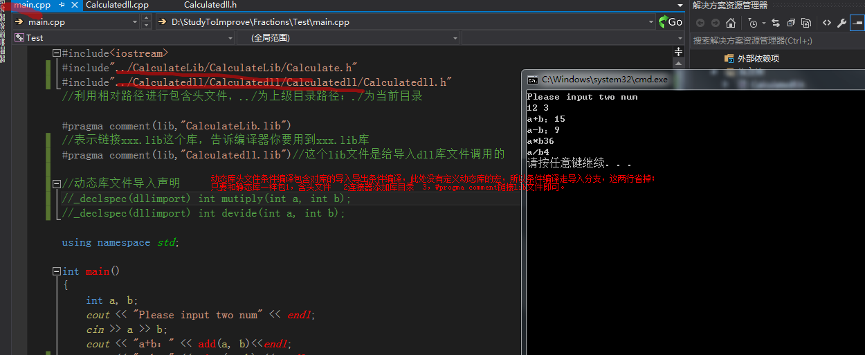 测试文件中添加动态库include包含动态库头文件和#pragma comment(lib)和动态库中函数的声明导入