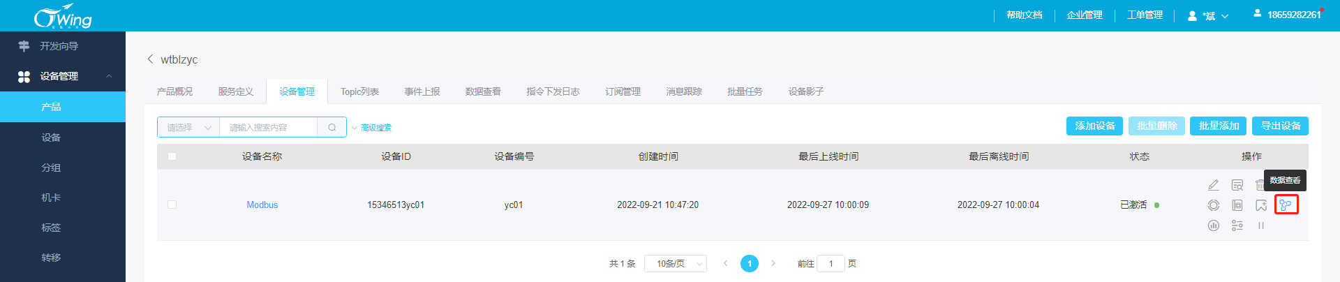 在产品——设备管理页面点击数据查看,即可查看网关上报的数据。