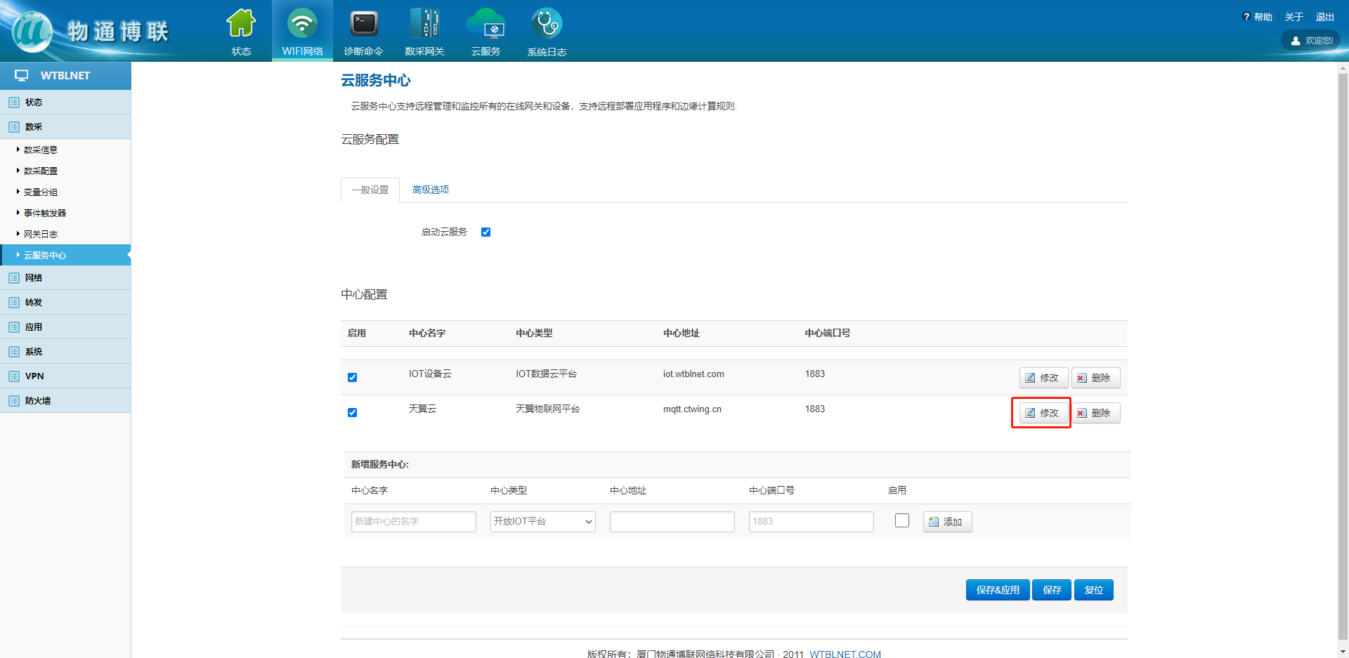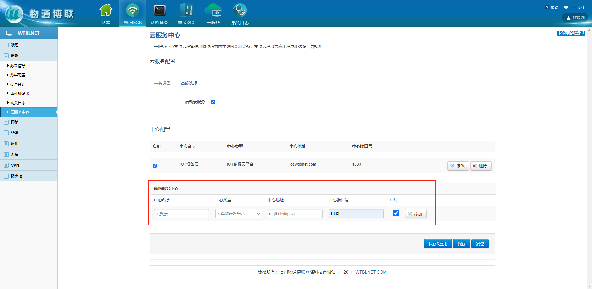 打开物通博联网关Web界面==>点击云服务==>中心类型选择天翼物联网平台==>输入相应信息==>勾选启用==>点击”添加”。