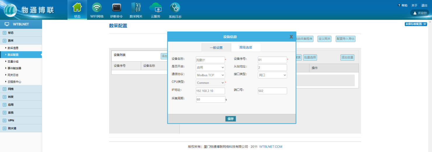 在网关Web页面点击数采配置——添加设备,配置通信协议以及通信参数。