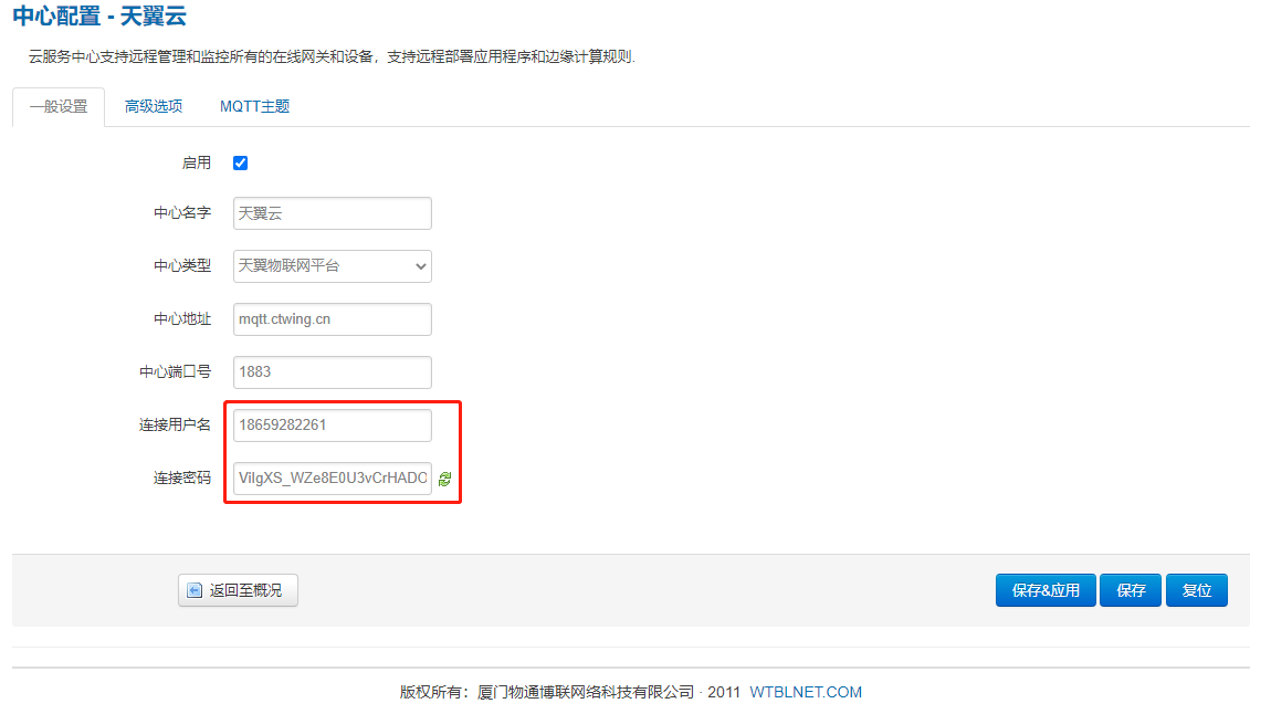 补全参数,连接用户名为天翼物联网平台的登陆账号,连接密码和客户端ID的获取方法在本文档中一、(四)处查看,填写完点击保存&应用。