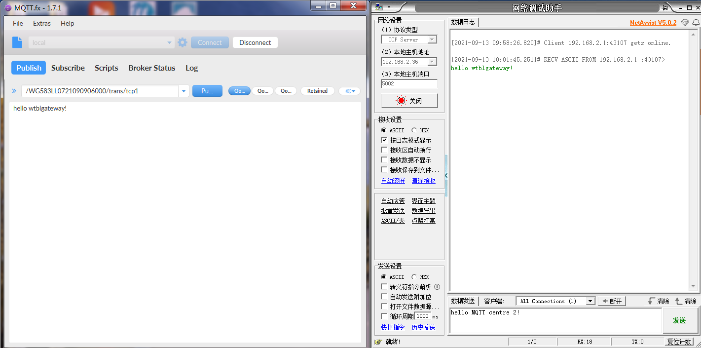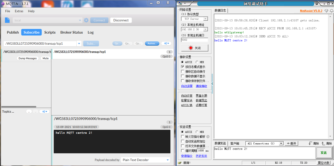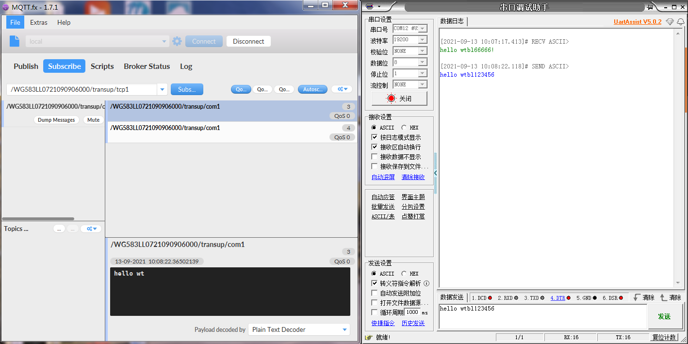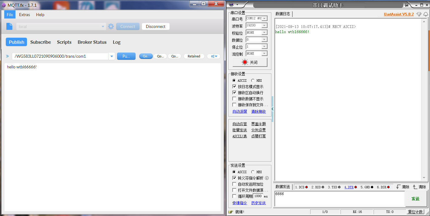 MQTT服务器(MQTT.fx工具模拟)下发消息给网关底下的串口设备(串口调试助手模拟)
