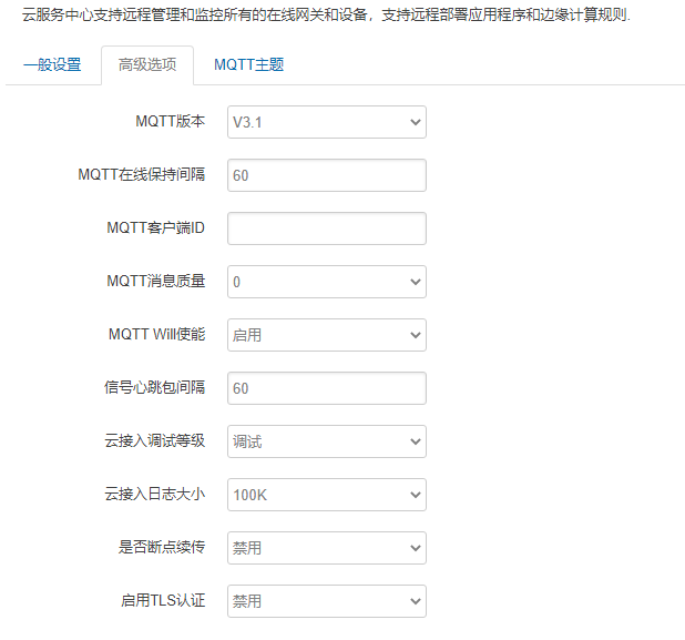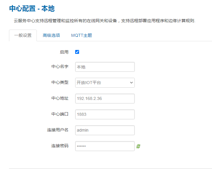 中心类型选择开放IOT 平台;中心地址填写MQTT服务器地址;