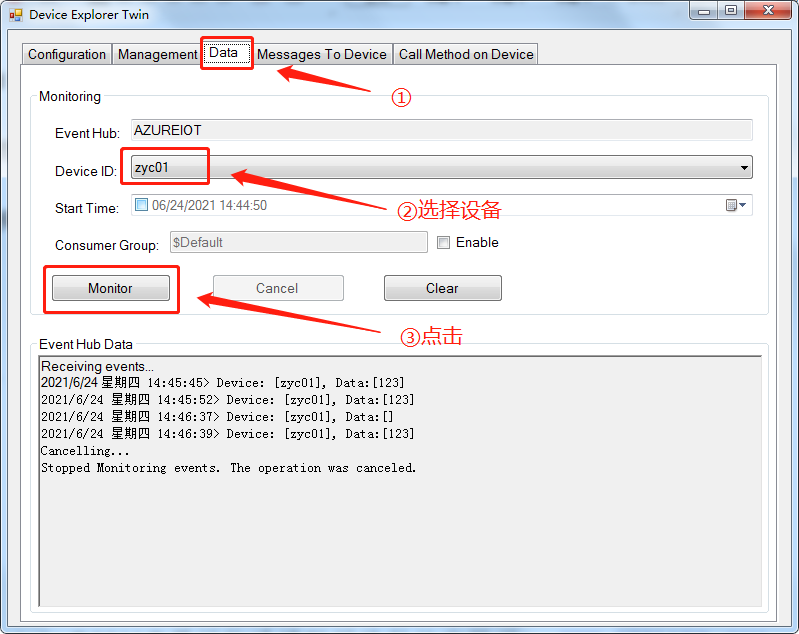 打开配置工具软件,切换到”data”选项卡,再点击”monitor”按钮进行消息接收;