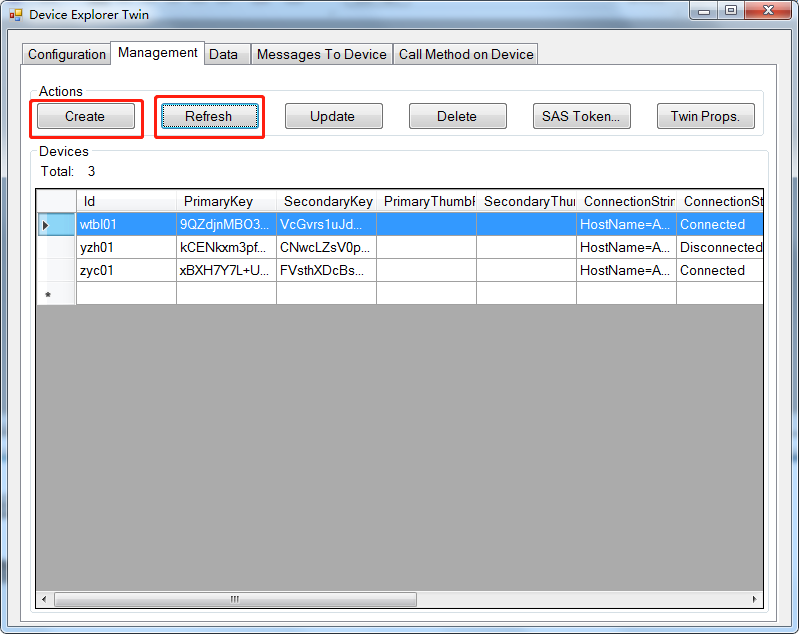 切换到”Management”选项卡,点击”create”或”refresh/list”按钮,如果正常,就能够把在平台配置的设备信息同步下来。