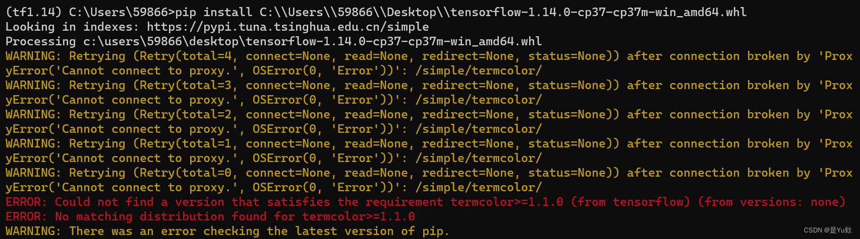 WARNING: Retrying (Retry(total=4, connect=None, read=None, redirect=None, status=None)) after connection broken by ‘ProxyError(‘Cannot connect to proxy.’, OSError(0, ‘Error’))’: /simple/termcolor/