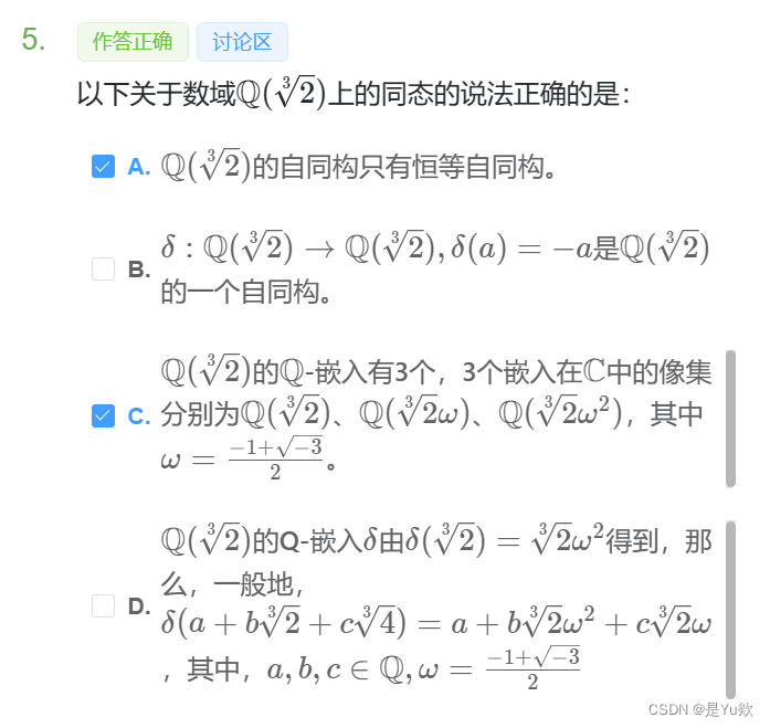 选项D:错误。描述的 Q \mathbb{Q} Q-嵌入 δ \delta δ 不正确。正确的 Q \mathbb{Q} Q-嵌入应该是 δ ( 2 3 ) = 2 3 ω \delta(\sqrt[3]{2}) = \sqrt[3]{2}\omega δ(32)=32ω 或 2 3 ω 2 \sqrt[3]{2}\omega^2 32ω2,而不是 2 3 = 2 3 ω 2 \sqrt[3]{2} = \sqrt[3]{2}\omega^2 32=32ω2。