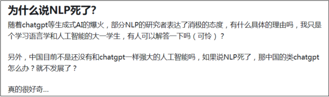 自从 ChatGPT 横空出世以来,自然语言处理(Natural Language Processing,NLP) 研究领域就出现了一种消极的声音,认为大模型技术导致 NLP “死了”。在某乎上就有一条热门问答,大家热烈地讨论了这个问题。