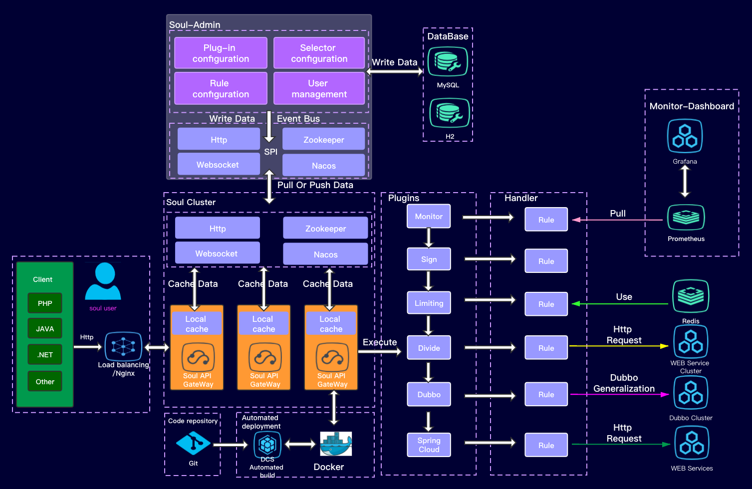- Soul-Admin 主要负责管理插件和配置流量控制的规则,配置数据会通过 http 长轮询、websocket、zookeeper、nacos 等多种方式同步给 Soul-bootstrap。