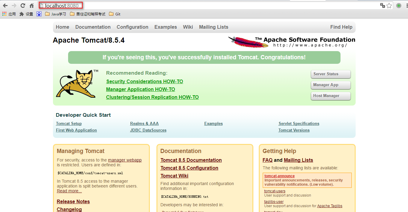 在浏览器中输入:"localhost:8080"测试tomcat是不是启动成功。