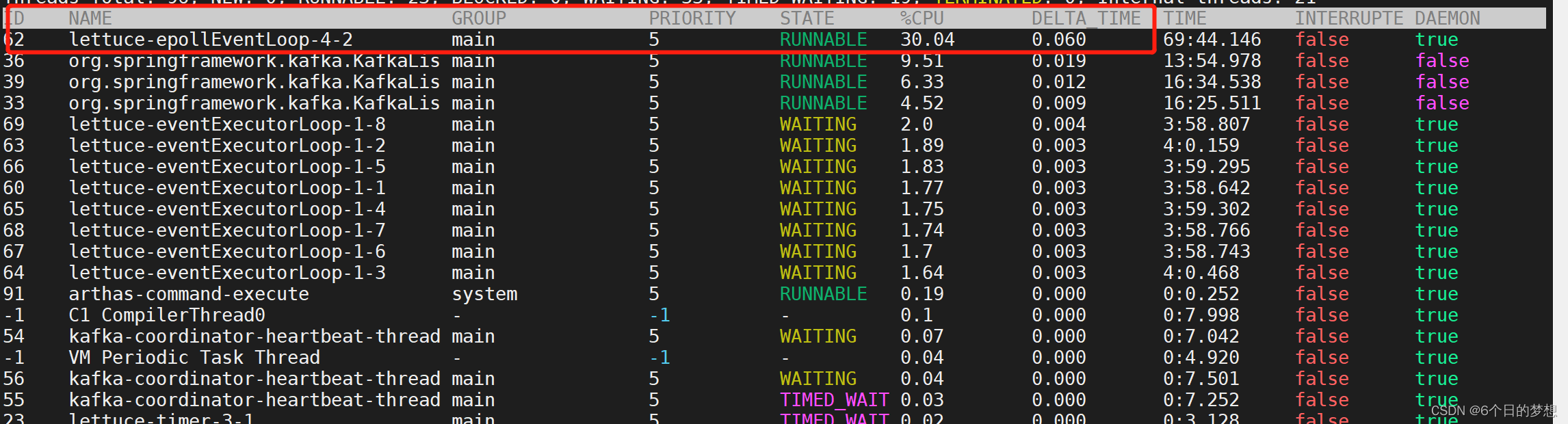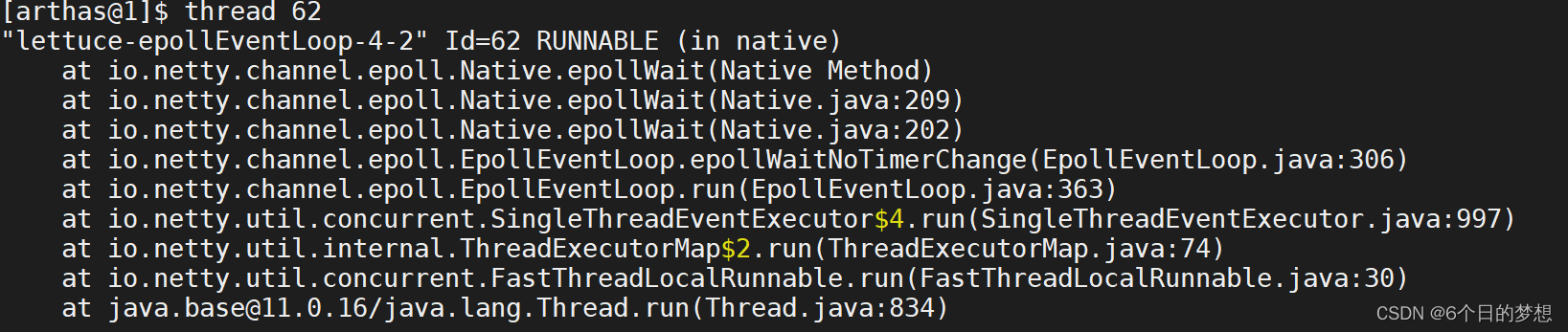 发现和jstack命令差不多,第一下称都是lettuce-epollEventLoop netty下的一个但线程池在等待线程,细心的会发现有lettuce-eventExecutorLoop-x-x的线程都处于WAITING状态。