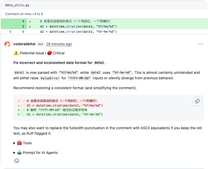 CodeRabbit 通常会带着“可直接应用”的代码块:
