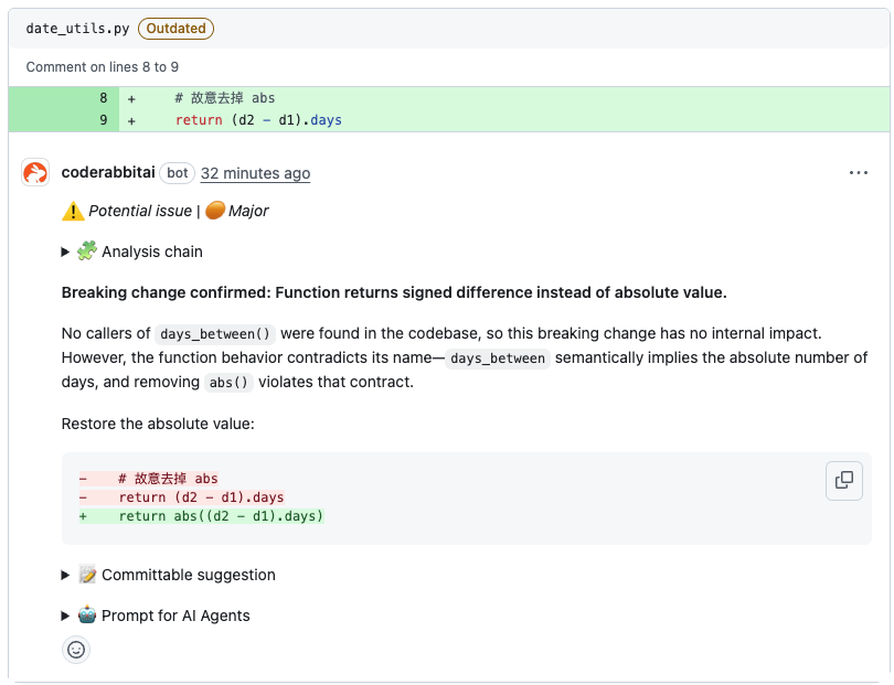 在整个实操过程中,你会发现 CodeRabbit 并不是一个“炫技型”的 AI,而是一个真正能够陪你把代码写得更稳、更安全的伙伴。它不会用复杂的方式强行接管你的代码,而是像一位耐心的工程师一样,把每一处潜在的问题都单独指出来,把风险解释清楚,再把应该如何调整的思路告诉你,让你在修改的过程中逐渐形成更好的编码习惯。