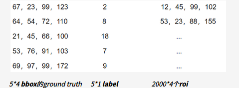 RPN输出的2000个roi作为ProposalTargetCreator的输入,同时输入的还有一张图上的所有bbox、label的ground trurh。如果此输入图像里有5个object,那么就有5个bbox和5个label。那么这时的三个输入可能是:下面我们将使用此例R=5来分析: