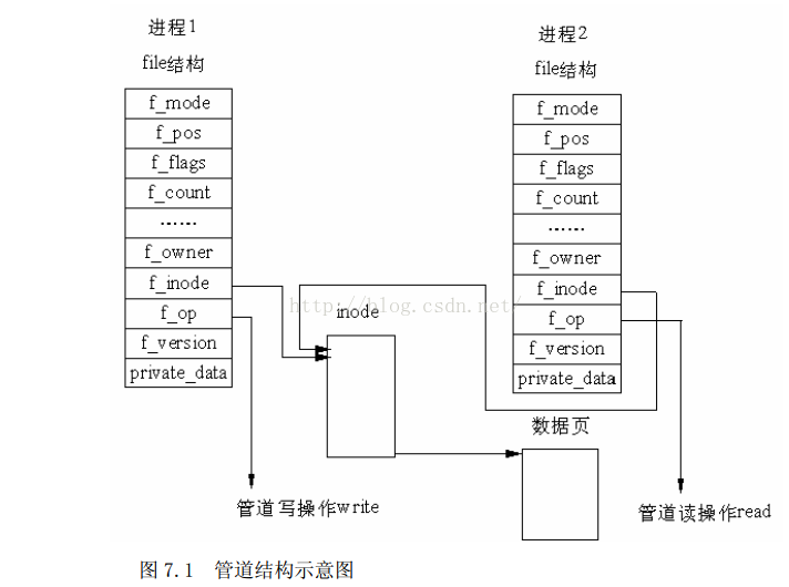 图 7.1 中有两个 file 数据结构, 但它们定义文件操作例程地址是不同的, 其中一个是向管道中写入数据的例程地址, 而另一个是从管道中读出数据的例程地址。 这样, 用户程序的系统调用仍然是通常的文件操作, 而内核却利用这种抽象机制实现了管道这一特殊操作。
