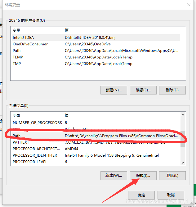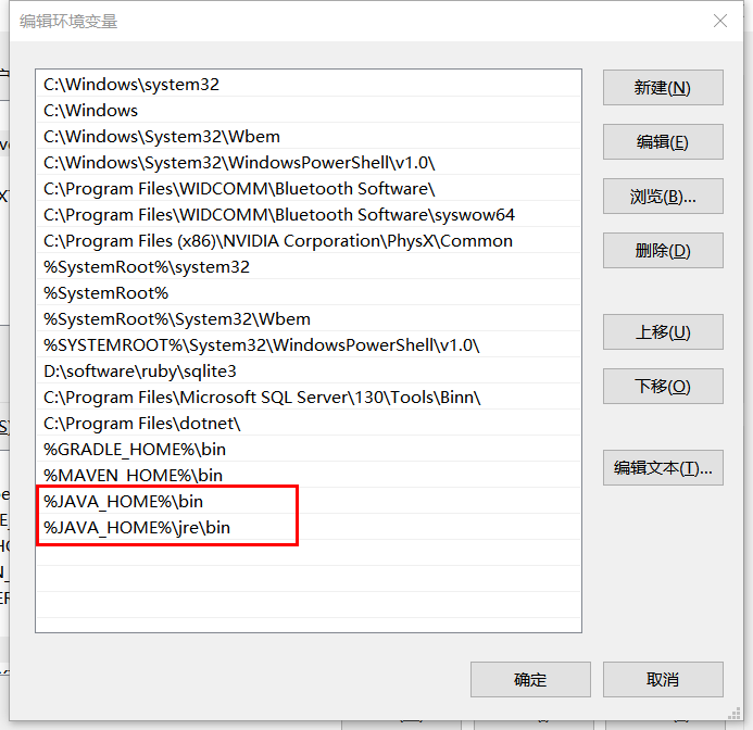 在变量值最后输入 %JAVA_HOME%\bin;%JAVA_HOME%\jre\bin;(注意原来Path的变量值末尾有没有;号,如果没有,先输入;号再输入上面的代码)