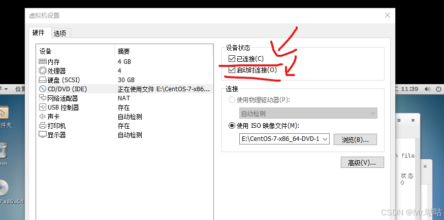 2.挂载CD,点击右下角的光盘图标或者进入虚拟机设置,连接CD