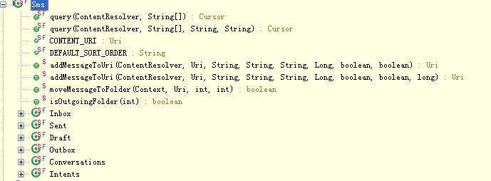 Sms中定义了6个内部类:Inbox、Sent、Draft、Outbox、Conversations、Intents。