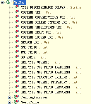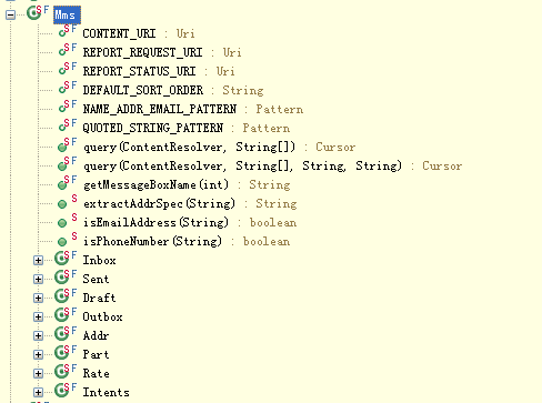 - Telephony.java (隐藏类,在Android 的source源代码中可以找到,如:sources\android-14\android\provider\Telephony.java )