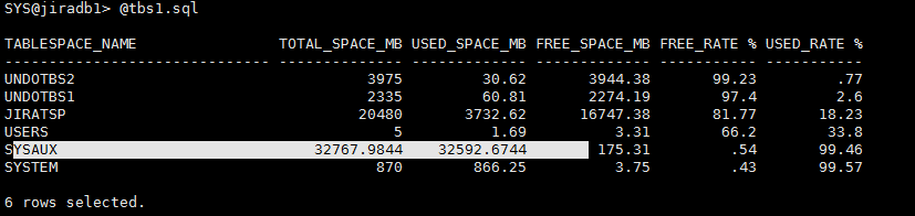 ROUND((T.TOTAL_SPACE_MB-F.FREE_SPACE_MB)/T.TOTAL_SPACE_MB*100,2) "USED_RATE %"