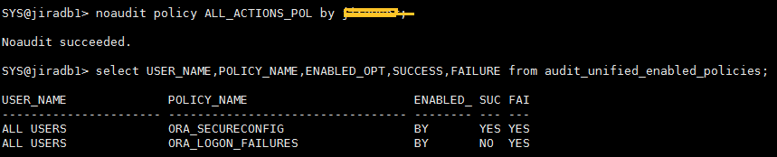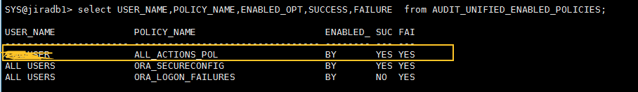 select USER_NAME,POLICY_NAME,ENABLED_OPT,SUCCESS,FAILURE from AUDIT_UNIFIED_ENABLED_POLICIES;