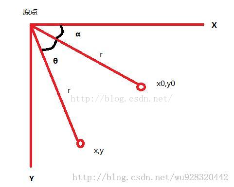 这里x0,y0是变换前的坐标,x,y是变换后的坐标,θ为旋转的角度,α是x0,y0与原点之间的夹角,r为到原点的长度。