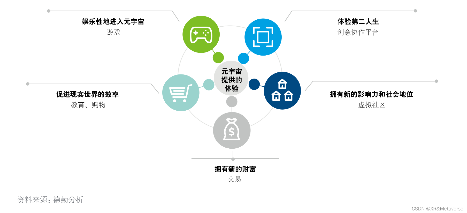 长远来看,元宇宙可以带给人们的价值是多方面的,有精神的,有物质的,包括5个方面: