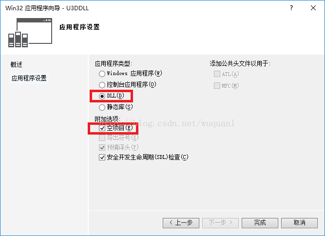 2. 选择应用程序类型为DLL的空项目