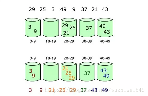 下图给出了对{ 29, 25, 3, 49, 9, 37, 21, 43 }进行桶排序的简单演示过程
