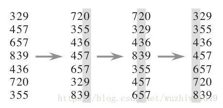 下图给出了对{ 329, 457, 657, 839, 436, 720, 355 }进行基数排序的简单演示过程
