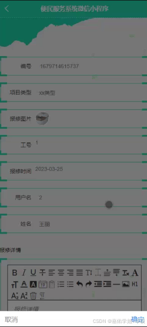 - 维修申报与处理反馈:居民可通过小程序提交维修申请,系统自动分配至相应维修人员,并实时反馈处理结果。