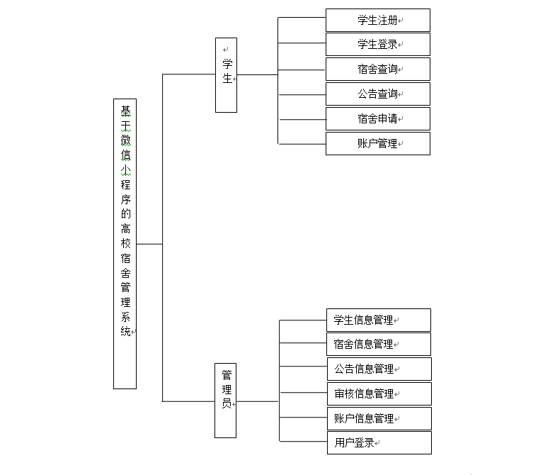 基于微信小程序的高校学生宿舍系统管理依据用户不同,划分为前台功能模块和后台功能模块。