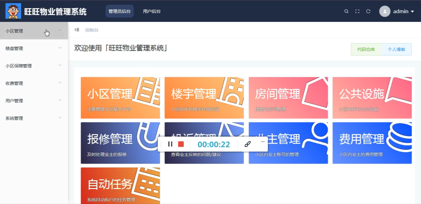后台管理功能主要实现:物业员工信息登记设置、住户信息登记设置、小区基本信息登记设置、周边设施信息登记设置、物业公告信息登记设置、楼宇信息登记设置、房屋信息登记设置、报修信息登记设置、投诉信息登记设置和收费信息登记设置及系统设置管理等。