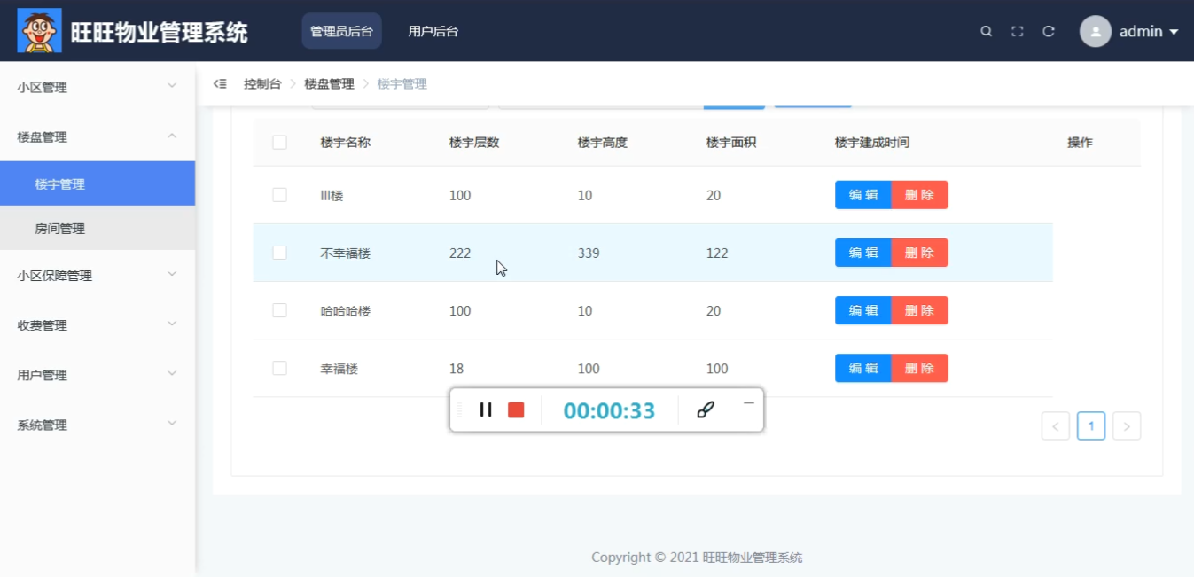 (6)楼宇信息管理模块:实现小区楼宇信息的登记处理