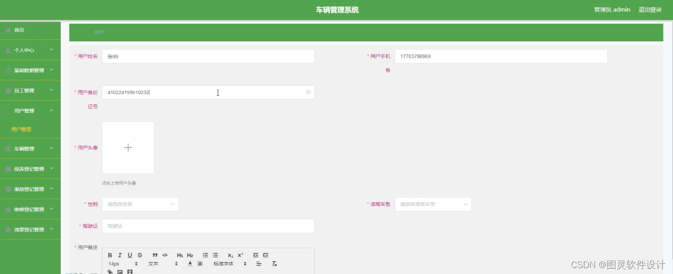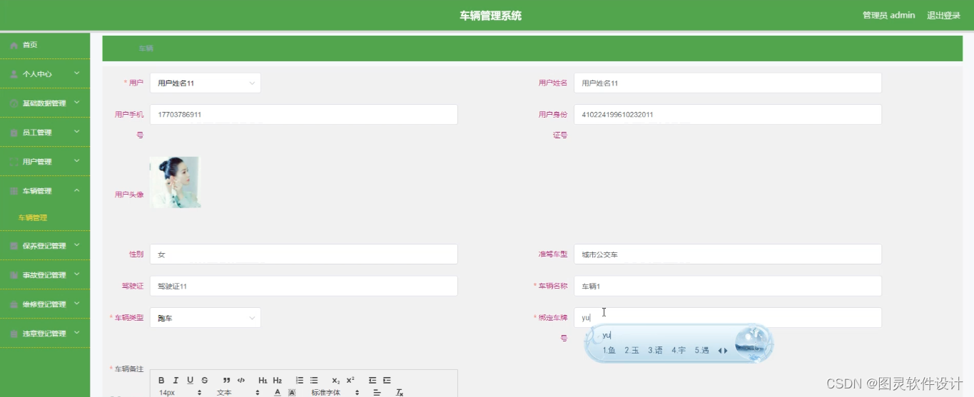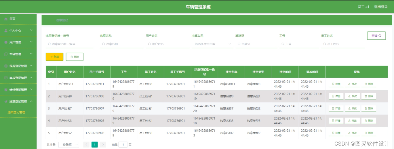 本文首先介绍了车辆管理系统的研究背景与意义,其次介绍了系统的总体功能设计,接着将总体功能设计拆分成了各个功能子模块,然后对每一个小的功能子模块进行了详细设计,最后介绍了系统的功能模块展示结果和测试结果。系统主要分为管理员角色和用户角色,具体的功能设计包括注册登录管理、用户信息管理、车辆信息管理、保养登记管理等模块。注册登录管理功能是新用户在使用系统前,需要通过注册步骤,登记详细的信息资料,而后再通过输入正确的账号和密码,成功登录系统后,即可通过一系列的操作来满足自己的相关需求。用户信息管理功能是管理相关的用户信息资料,管理人员根据现实情况的需要,选择性的对用户信息记录进行更新处理。车辆信息管理是管理相关的车辆信息记录,保存详情的车辆情况,方便及时响应用户的服务请求。保养登记管理是管理相关的保养登记信息记录,方便相关人员及时查看保养登记信息,如果遇到异常的保养登记信息,可以及时对其进行处理,在较短的时间内解决问题,提高用户的使用体验。
