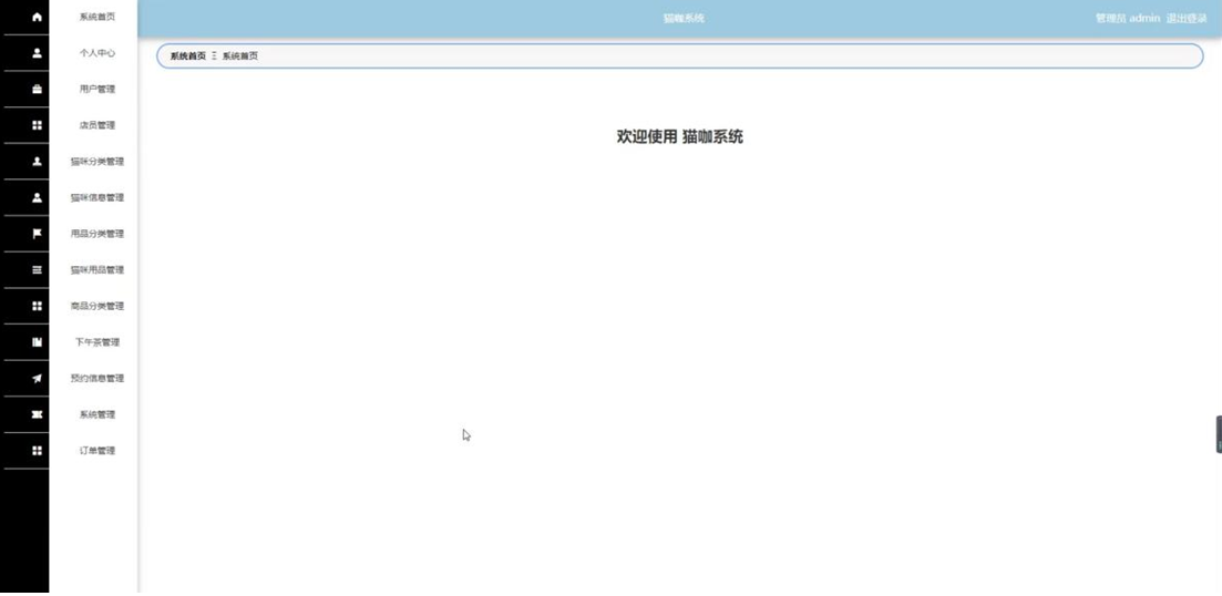- 管理员通过后台管理员界面,实现对系统首页,个人中心,用户管理,店员管理,猫咪分类管理,猫咪信息管理,用品分类管理,猫咪用品管理,商品分类管理,下午茶管理,预约信息管理,系统管理,订单管理等功能的操作;