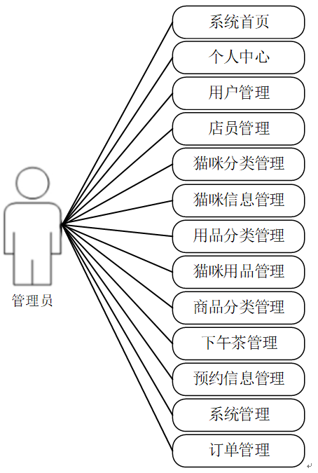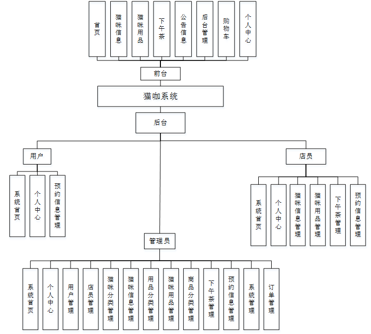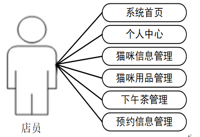 该系统由个人管理员,用户和店员三部分组成。其中:用户进入系统首页可以实现系统首页,个人中心,预约信息管理等;店员可以对系统首页,个人中心,猫咪信息管理,猫咪用品管理,下午茶管理,预约信息管理等功能进行管理;管理员则是根据不同需求设置了不同功能,可以通过后台管理用户信息。