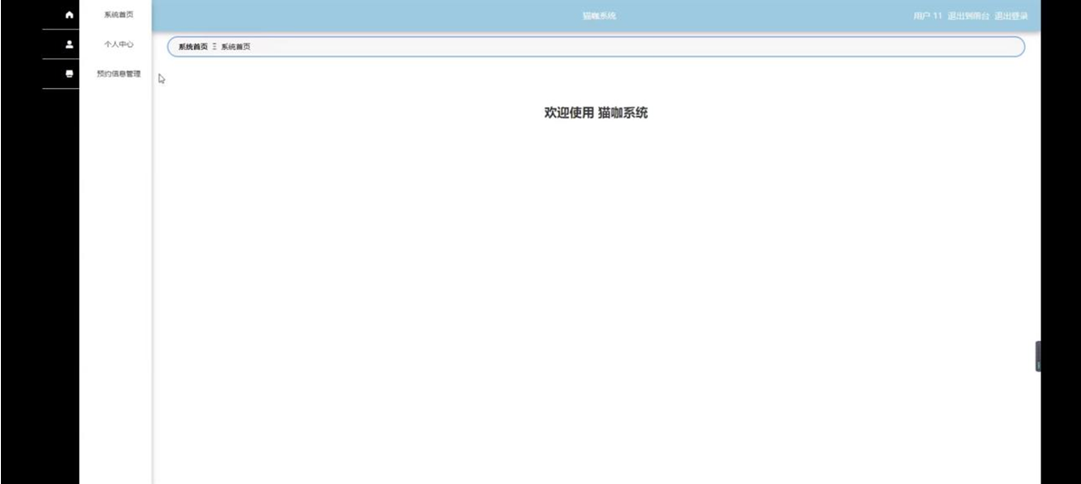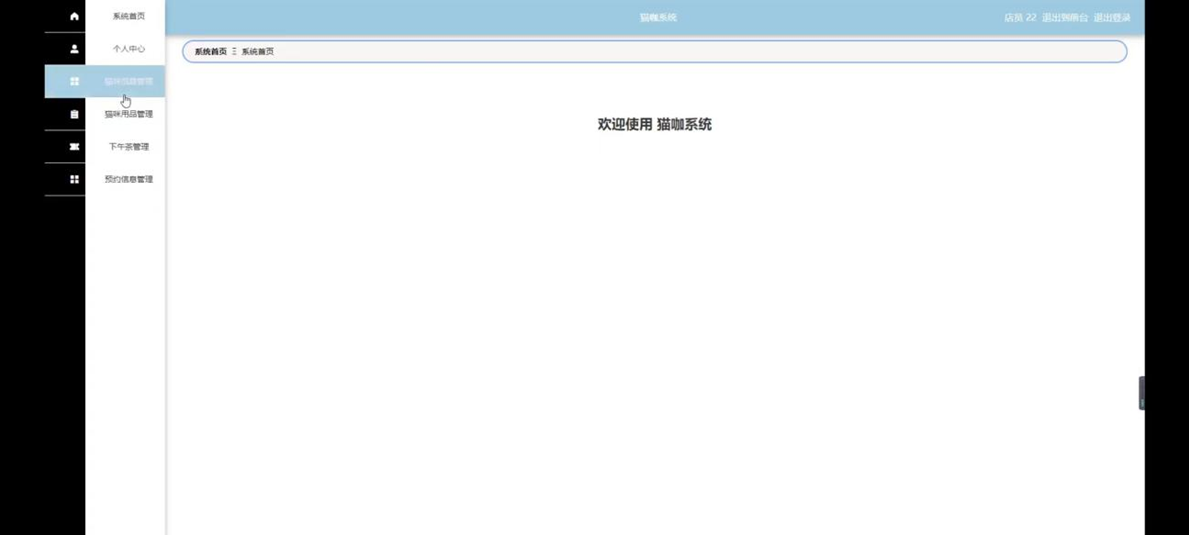 店员进入系统可以对系统首页,个人中心,猫咪信息管理,猫咪用品管理,下午茶管理,预约信息管理等功能进行操作。店员主页面如图