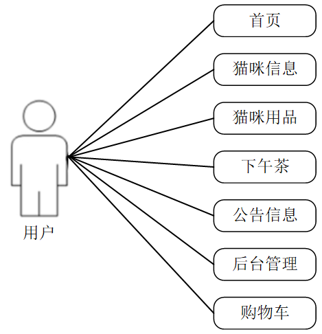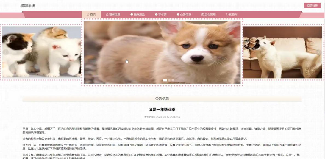 - 用户可以浏览主页了解猫咖信息,可以查看首页,猫咪信息,猫咪用品,下午茶,公告信息,后台管理,购物车等功能;