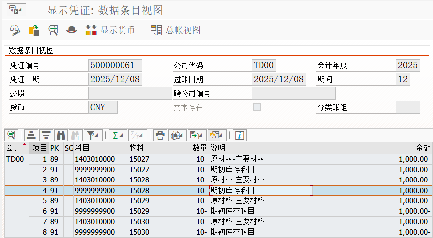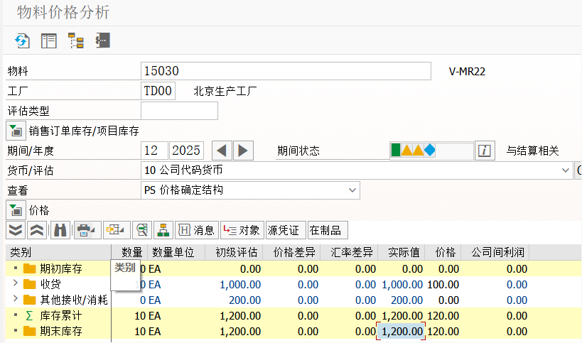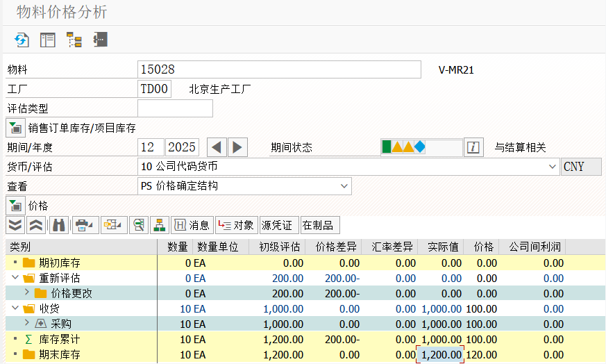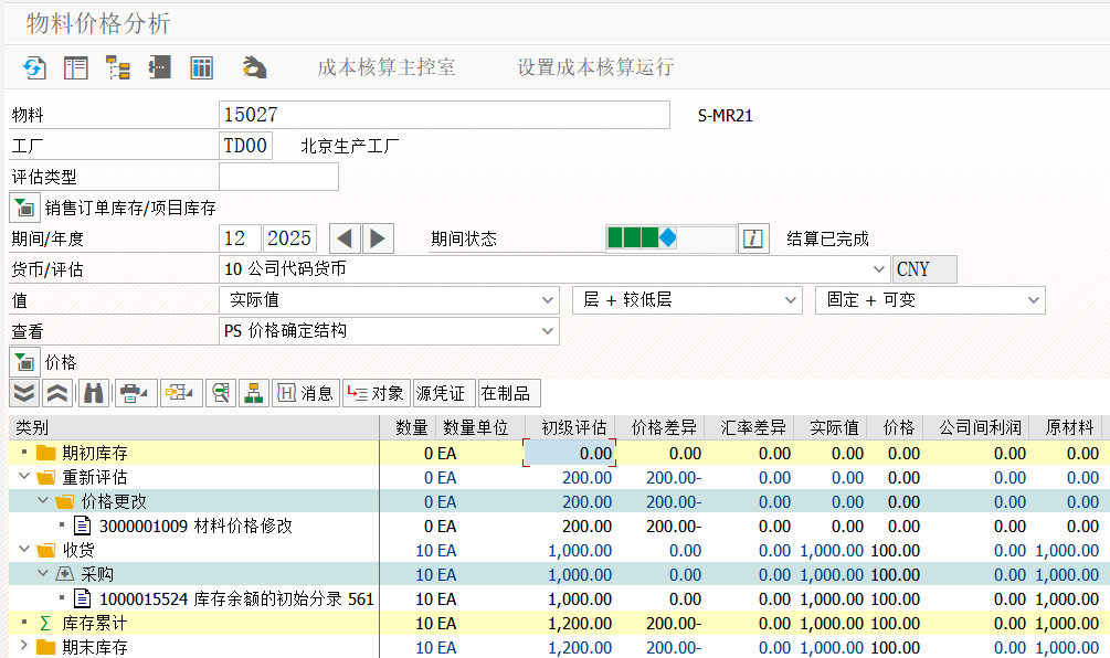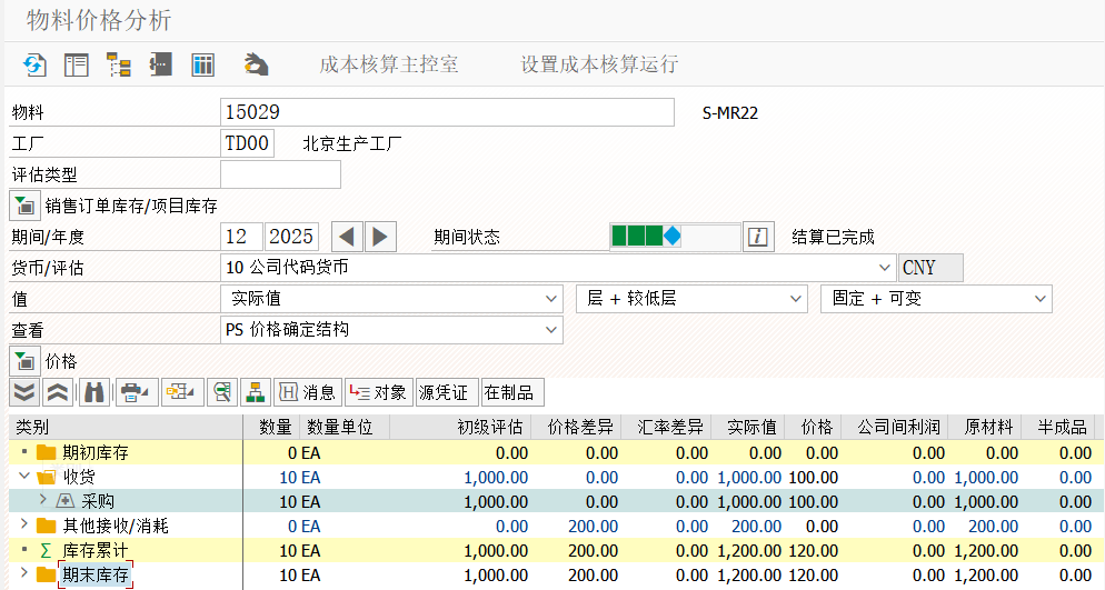 分别入库存10个,金额分别为1000,下图为初始化会计分录,初始化后S价物料无差异产生。下图为初始化会计凭证