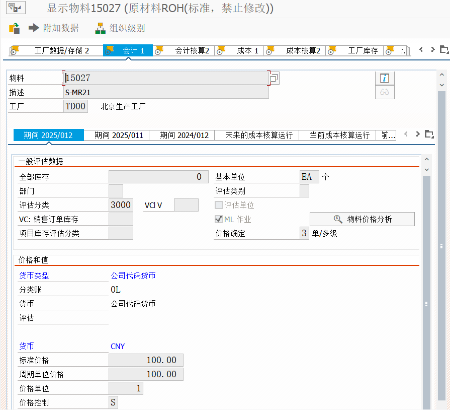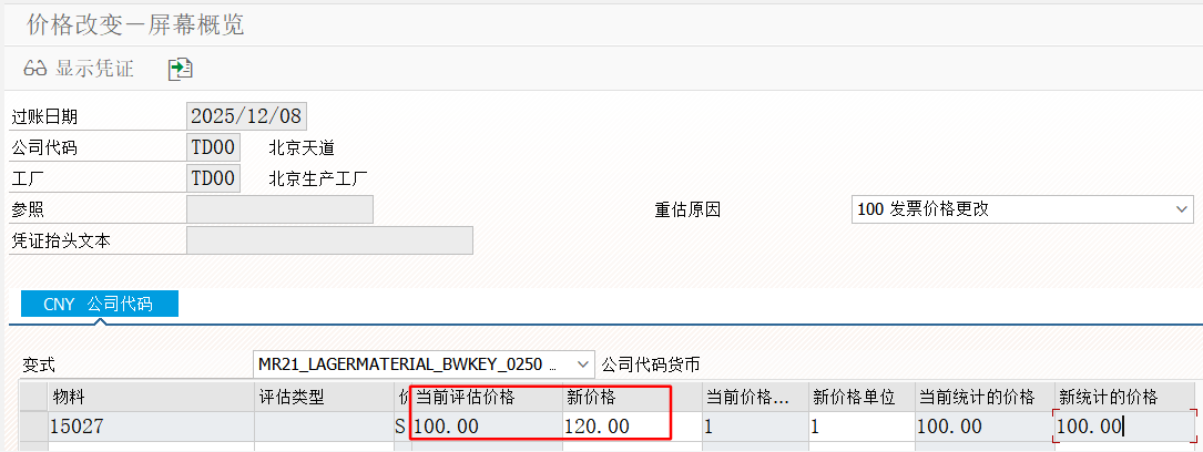 总结:使用MR21更改S物料价格,并不能真正使库存价值发生变化,价格更改产生的差异(OBYC-UMB),在CKMLCP滚算后,会将差异还原到库存,实际库存价值并没有发生变化。