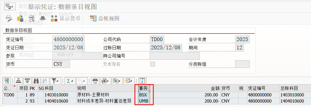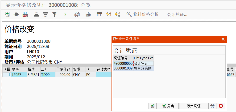 下图为价格更改凭证,新价格120,新旧价差=120-100=20,数量为10,所以产生20*10=200的差异.科目来源为OBYC-BSX、OBYC-UMB