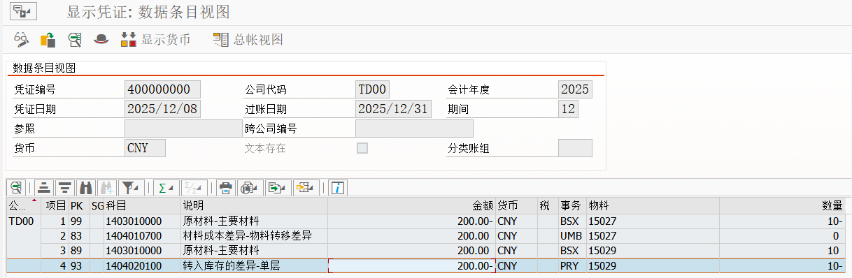 库存增加200,借方科目来源OBYC-PRD-UMB、贷方科目来源OBYC-UMB