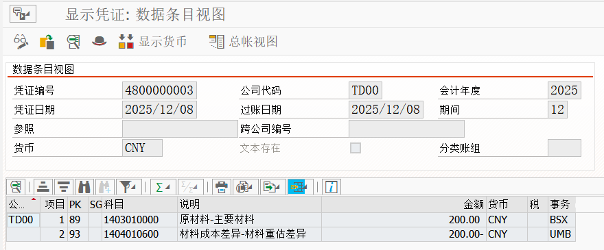 库存增加200,借方科目来源OBYC-BSX、贷方科目来源OBYC-UMB