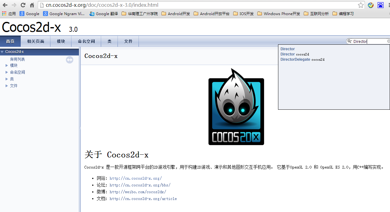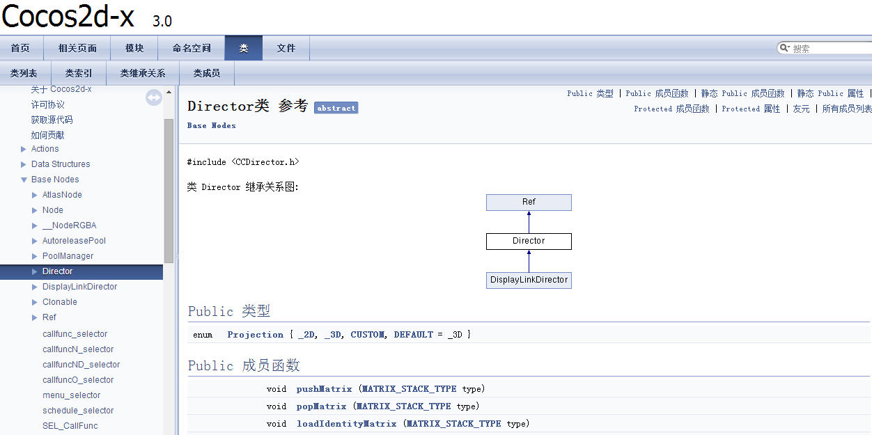 初学者可能对以上这些知识点比较疑惑,笔者是如何解惑的呢?首先我们需要了解最基础的东西,比如导演类、场景、层与精灵之间的关系,分别代表什么,如何进行创建,这是我们最起码要知道。Cocos2d-x官网也为我们提供了相应的基础教程,我们可以先了解相关基础概念,让自己大概知道Cocos2d-x这个东西能做些什么,然后再细化去学习。Cocos2d-x提供的API是非常丰富的,但我们不可能所有API都能记得住,但我们最起码需要知道如何去查询具体API的含义和使用方法。比如我们可以到http://cn.cocos2d-x.org/doc/cocos2d-x-3.0/index.html查询我们并不太熟悉的API。我们可以从中了解到类之间的继承关系,还有相关类的成员函数和成员变量,这对我们使用API是有很大帮助的。