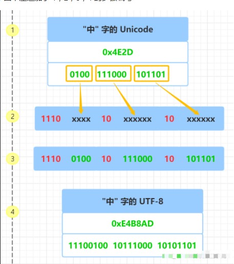 前面介绍过,UTF-8、UTF-16、UTF-32 是 Unicode 码表示成不同的二进制格式的编码规则,同样,通过这三种编码的二进制表示,也能获得对应的 Unicode 码,有了字符的 Unicode 码,按照上面介绍的 UTF-8、UTF-16、UTF-32 的编码方法 就能转换成任一种编码了。前面提到过,"中"字的 Unicode 码是4E2D, 它小于0x10000,根据表格可知,它的 UTF-16 编码占两个字节,并且和 Unicode 码相同,所以"中"字的 UTF-16 编码为4E2D。